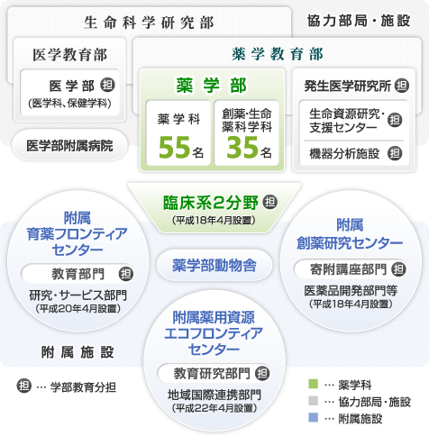 薬学部には未知の物質の構造を決定したり、それらの性質を調べるための設備が年々充実しており、これらは学部での教育・大学院での研究教育を支えています。さらに、平成18年には全国の国立薬学系大学では初めての「薬学部附属創薬研究センター」を設置しました。一方、臨床教育の充実を図るために、「薬学科」に臨床経験豊富な教員からなる2臨床薬学分野の設置、「臨床教授制度」(平成21年度)の導入、「薬学部附属育薬フロンティアセンター」(平成20年度)及び「模擬薬局」(平成21年度)を設置し、両学科を横断する形で「薬学部附属薬用資源エコフロンティアセンター」(平成22年度)が設置されました。さらに、両学科の教育を担当する寄附講座や充実した附属施設及び協力部局・施設を有しています。