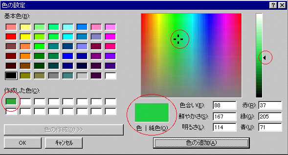 右側の2つのパレット内のカーソルを動かすと、対応する色が「色/純色」というところにあらわれます。希望の色のところで、「色の追加」ボタンをクリックすると、左側の「作成した色」のところに色が加わります。