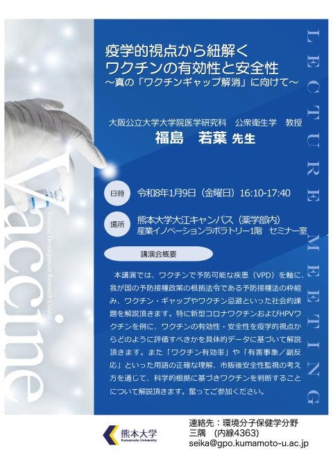 本講演会は、熊本大学ワクチン開発研究センター の活動を広く発信する貴重な機会でもあります。多くの皆様のご参加を心よりお待ちしております。