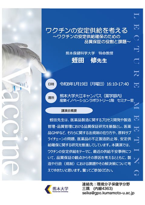 本講演会は、熊本大学ワクチン開発研究センターの活動を広く発信する貴重な機会でもあります。多くの皆様のご参加を心よりお待ちしております。