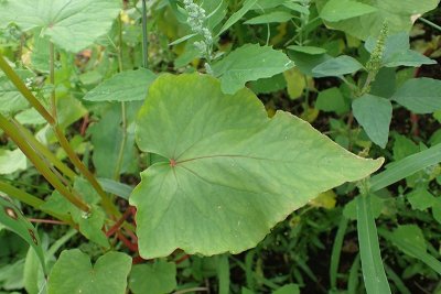 一年草.草丈30~70 cm.茎は直立分枝し,円柱形で中空.葉は互生し柄が長く,心形で先は鋭尖頭.短い総状花序をなして白色または淡紅色の小さな花を付ける.痩果は鋭い3稜を有する卵形.