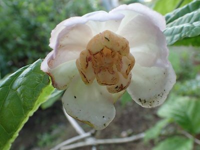 落葉低木.樹高1~3 m,株立ちする.葉は対生,葉身は楕円形,長さ15~20 cm,幅8~10 cm,葉縁には低い鋸歯がある.葉柄は長さ8~1.2 cm.花は赤味を帯びた白色,外側の花弁は大きく,内側の花弁は小さい.果実は楕円形の偽果で,長さ3~4 cm.