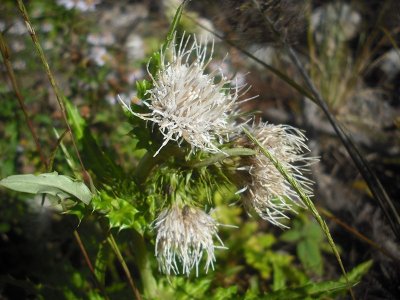 多年草.草丈40~200 cm.茎は上部で分枝するが枝はあまり伸長しない.根出葉は花時に無い.下部の茎葉の葉身はやや質が厚く,鈍い光沢があり,長さ20~40 cm,楕円形,羽状に深裂~中裂し,鋭いトゲがある.頭花は数個が散房状に密集して付くか塊状に付き,点頭する.花冠は長さ18~20 mm,ほとんど白色に近い,ごく淡い淡紫色.